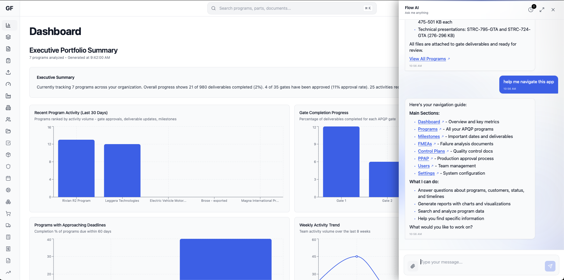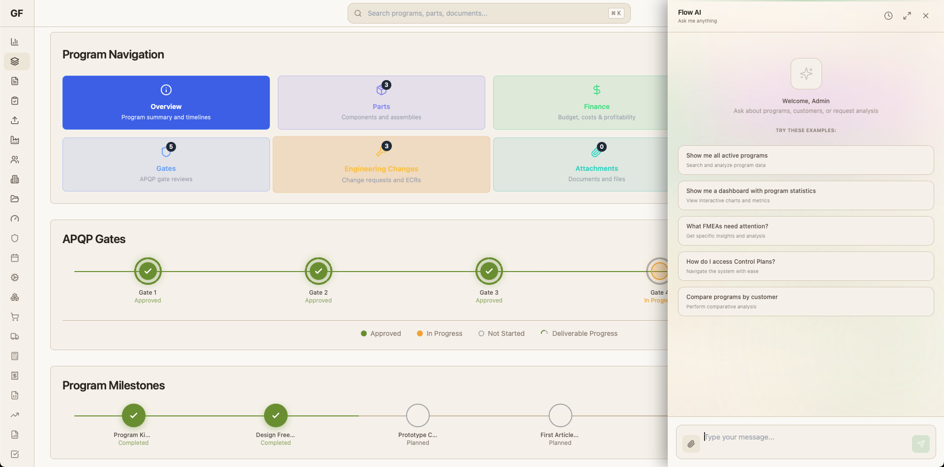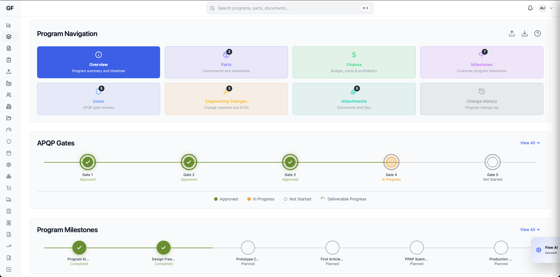Main program dashboard showing projects, timelines, and key milestones