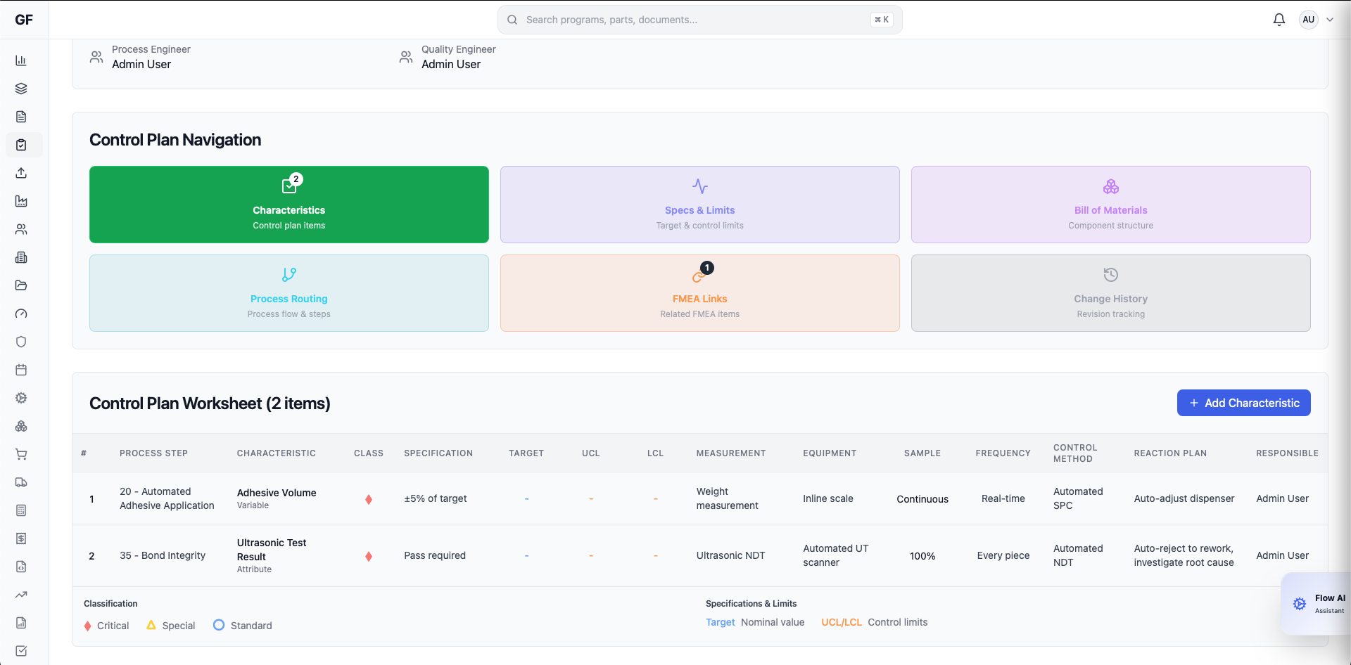 Configure control plans with inspection points, acceptance criteria, and measurement methods