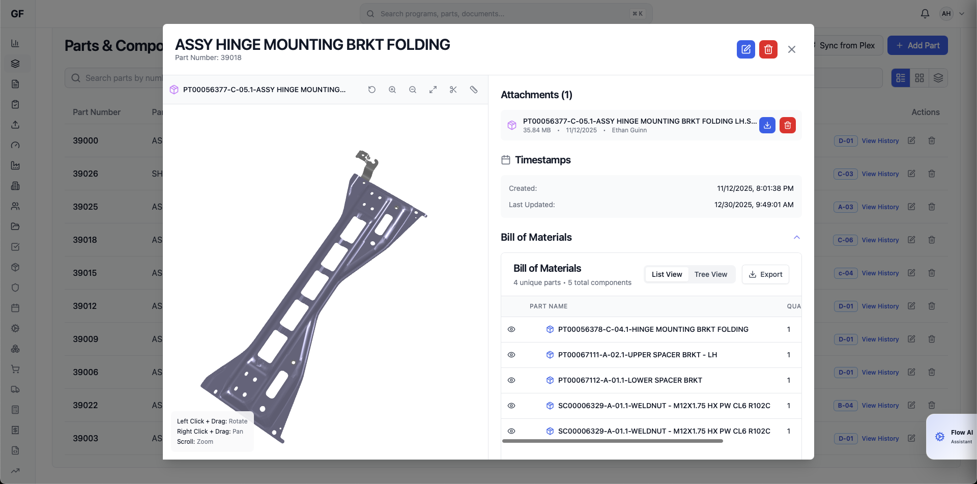 Comprehensive part information including CAD files, BOM, specifications, and history